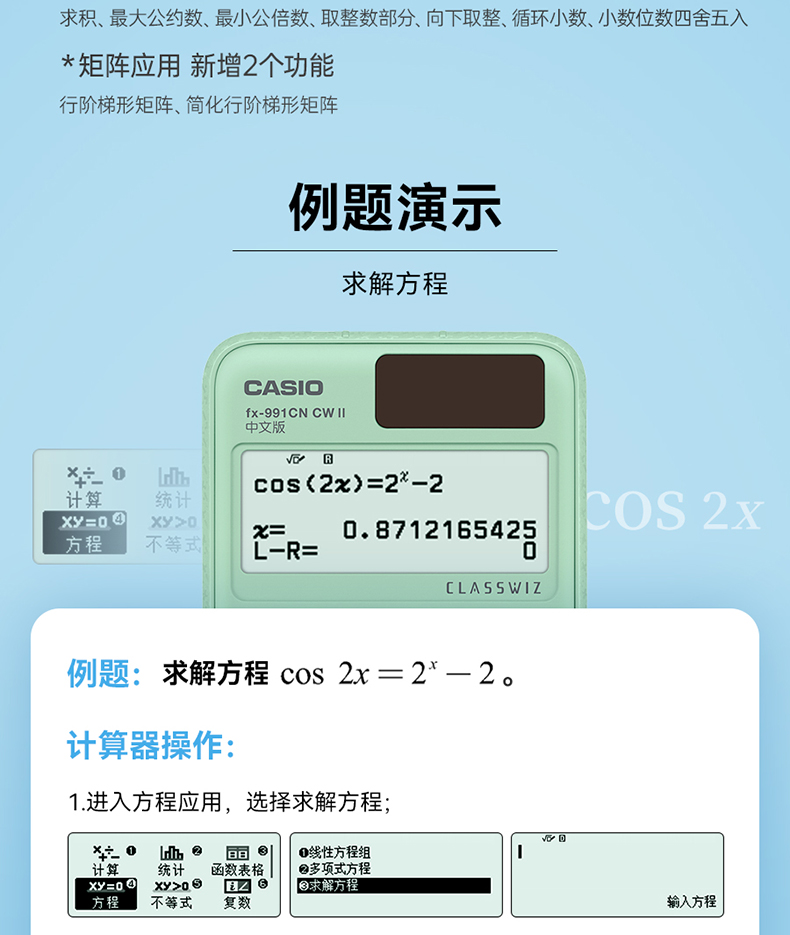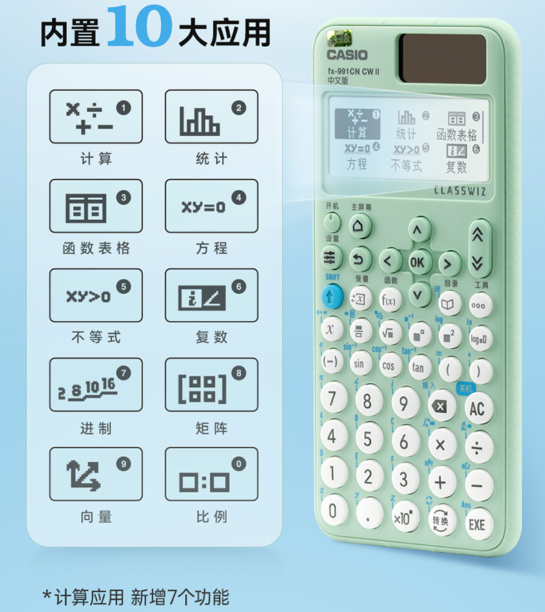 | 功能关键词: | 不等式,统计计算,解方程,向量,中文显示,复数,函数表格,矩阵,三角函数 | 颜色: | 粉色,黑色,灰色,绿色 |