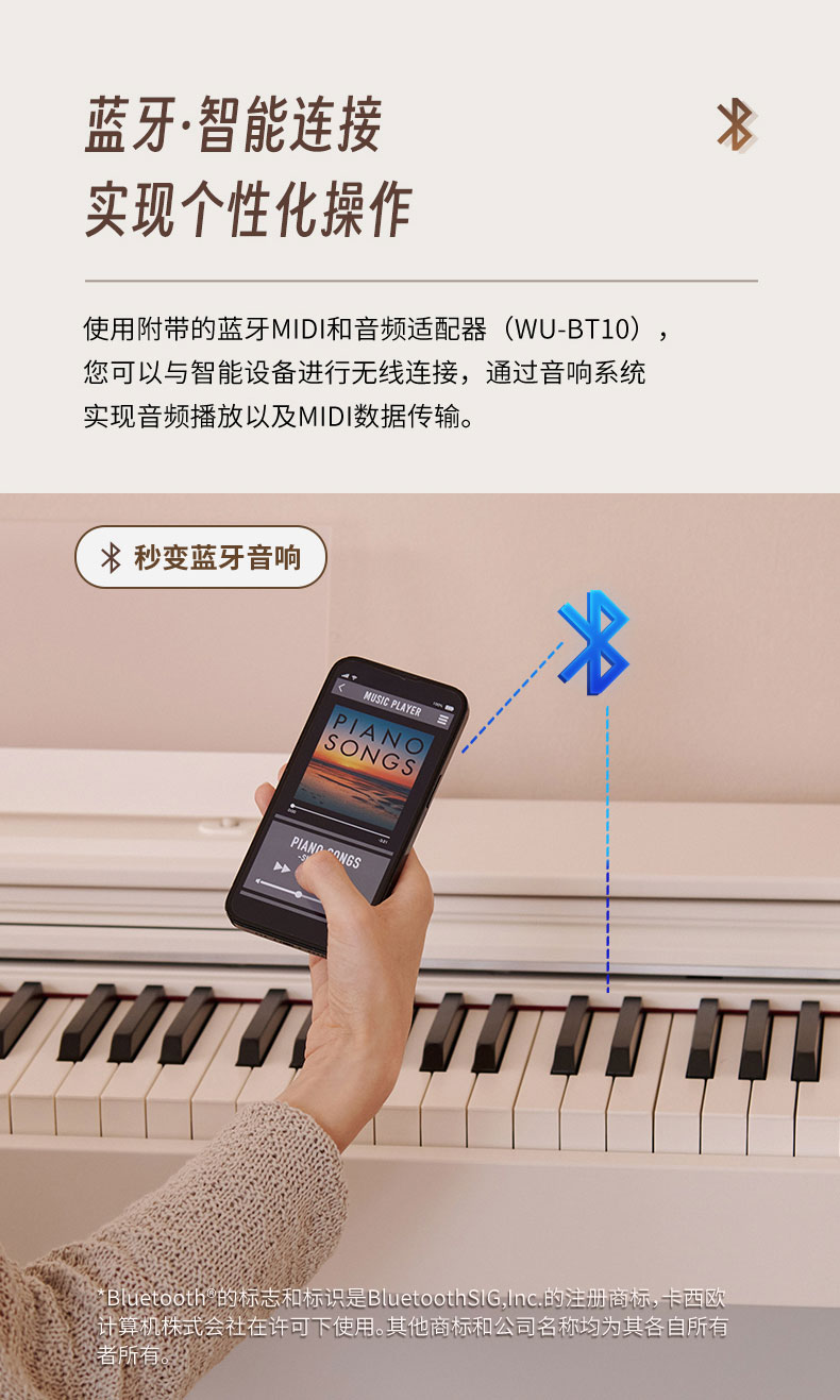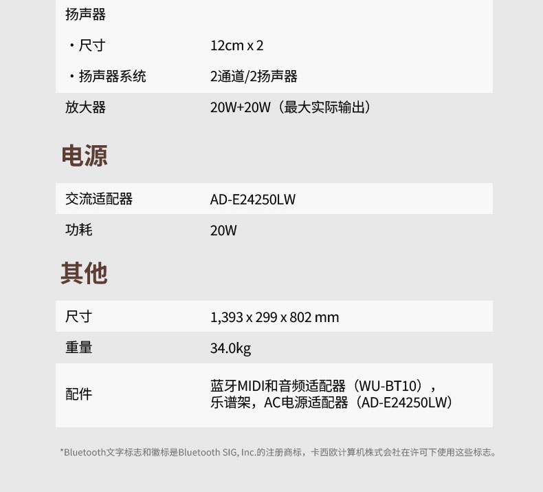 附件:蓝牙 MIDI 和音频适配器 (WU-BT10)、乐谱架、AC电源适配器 (AD-E24250LW)