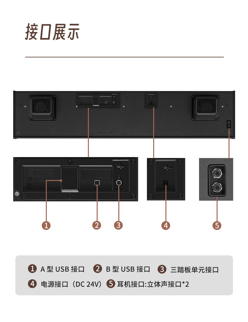 踏板接口: 3踏板(包括):制音(2级,关闭)、柔音、抽选延音