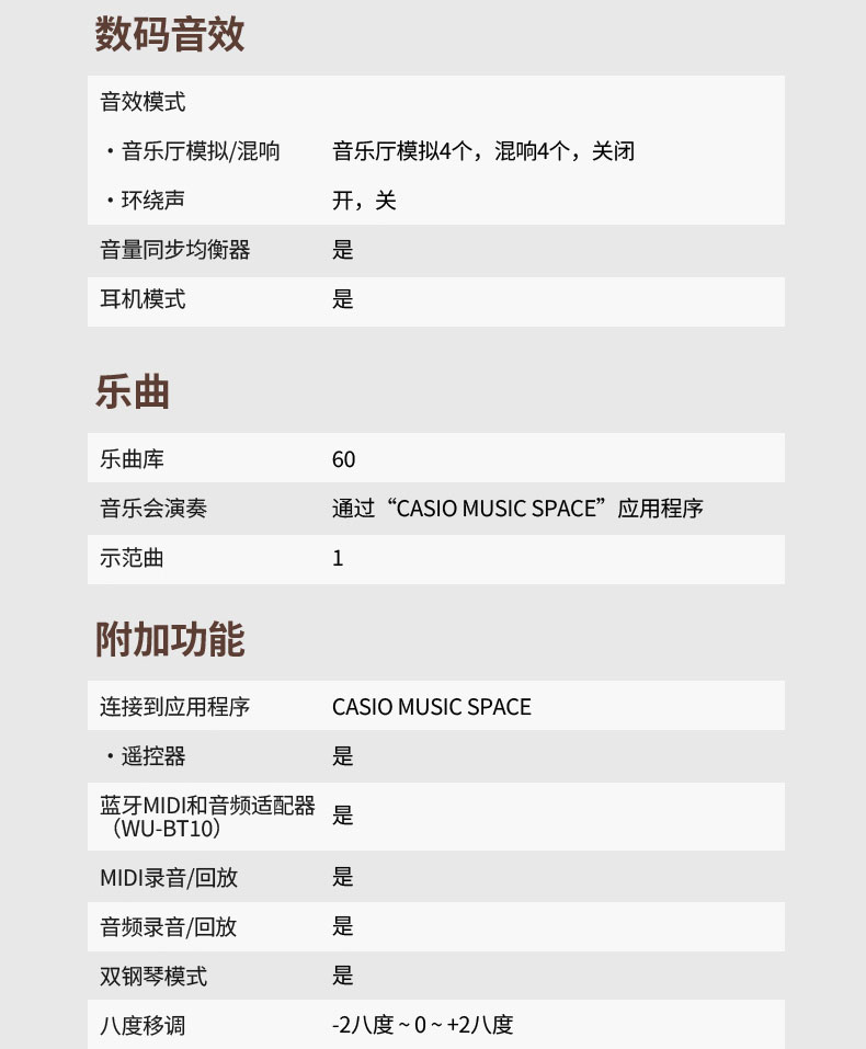 乐曲扩展: ・音乐会演奏:通过“CASIO MUSIC SPACE”应用程序・示范曲:1