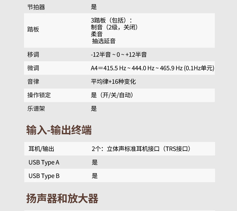 输入/输出终端: ・耳机/输出:2个:立体声标准耳机接口(TRS 接口)・USB 端口:是(类型 A、类型 B)