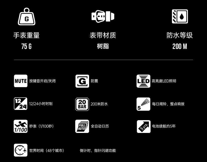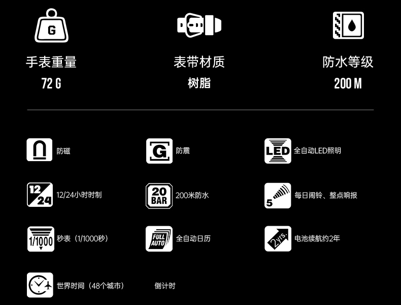 | 主要功能: | 防震,LED照明,12/24小时时制,200米防水,每日闹铃、整点响报,秒表(1/100秒),全自动日历,世界时间(38个城市),倒计时 | 人群: | 男士 |