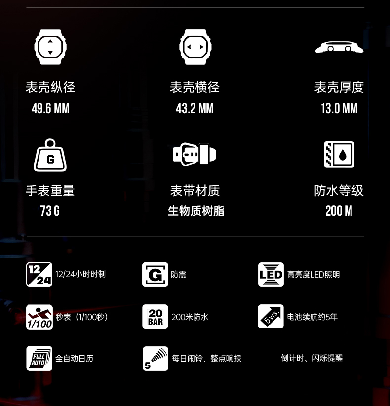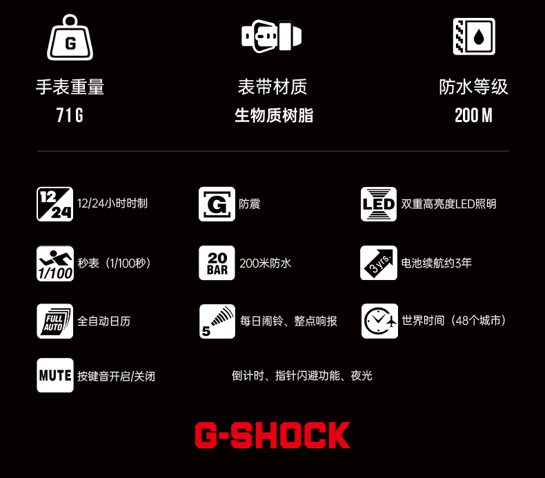 | 手表种类: | 男表 | 主要功能: | 12/24小时时制,防震,高亮度LED照明,秒表(1/100秒),200米防水,电池续航约3年,全自动日历,每日闹铃、整点响报,倒计时 |