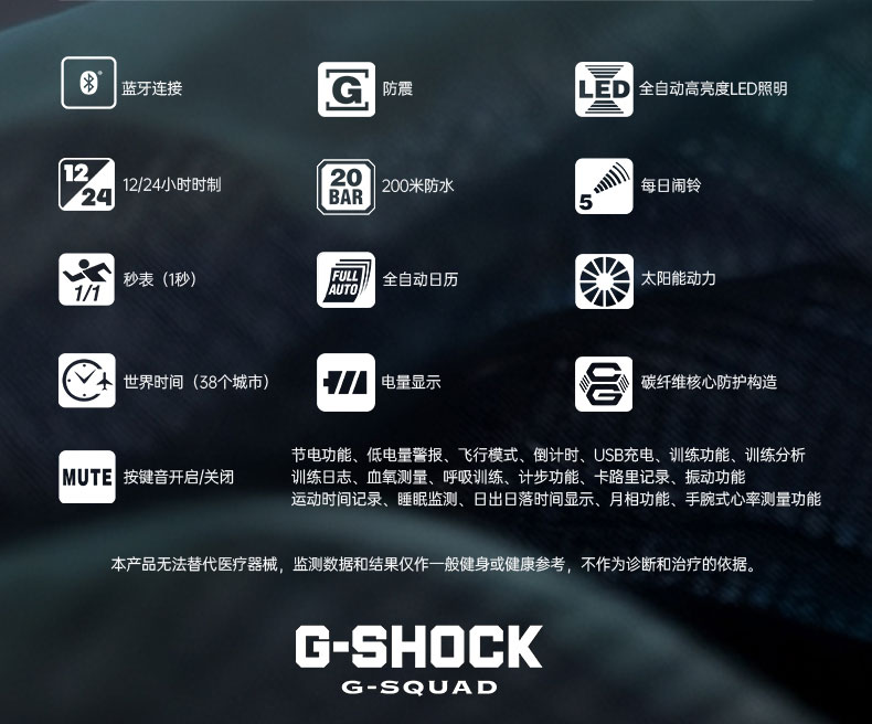 | 显示类型: | 数字 | 主要功能: | 蓝牙连接,防震,全自动高亮度LED照明,12/24小时时制,200米防水,每日闹铃,秒表(1秒),全自动日历,太阳能动力,世界时间(38个城市),电量显示,碳纤维核心防护构造,按键音开启/关闭,节电功能,低电量警报,飞行模式,倒计时,USB充电,训练功能,训练分析,训练日志,血氧测量,呼吸训练,计步功能,卡路里记录,振动功能,运动时间记录,睡眠监测,日出日落时间显示,月相功能,手腕式心率测量功能 |