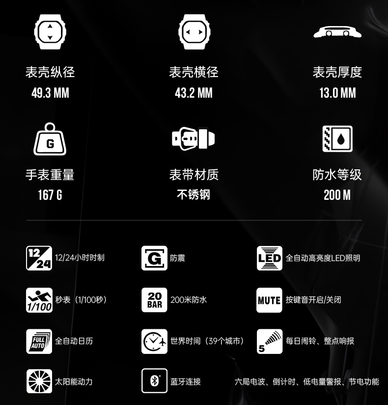 主要功能: 12/24小时时制,防震,全自动高亮度LED照明,秒表(1/100秒),200米防水,按键音开启/关闭,全自动日历,世界时间(39个城市),每日闹铃、整点响报,太阳能动力,蓝牙连接,六局电波,倒计时,低电量警报,节电功能