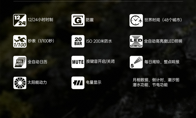 | 显示类型: | 数字 | 主要功能: | 12/24小时时制,防震,世界时间(48个城市),秒表(1/100秒),ISO 200米防水,全自动高亮度LED照明,全自动日历,按键音开启/关闭,每日闹铃、整点响报,太阳能动力,电量显示,月相数据,倒计时,潮汐图,潜水功能,节电功能 |