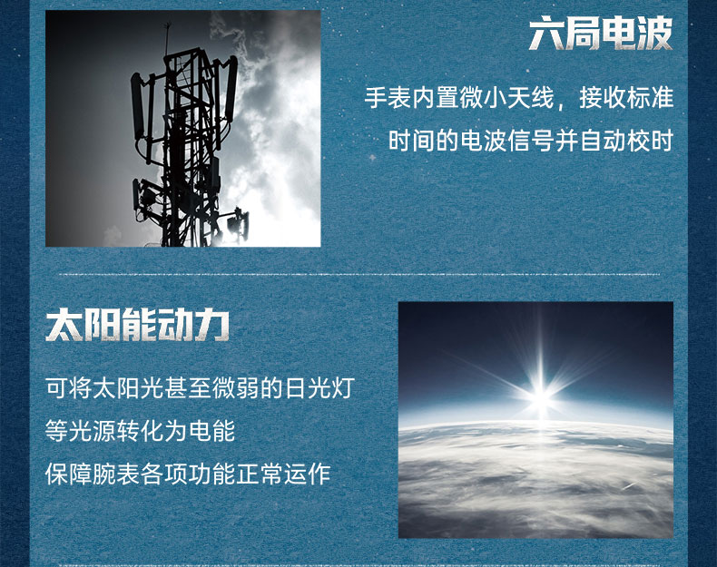 功能关键词: 蓝牙,秒表,电波,太阳能动力,6局电波,防水,防震,世界时间,指针,人造蓝宝石玻璃
