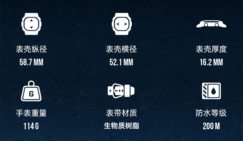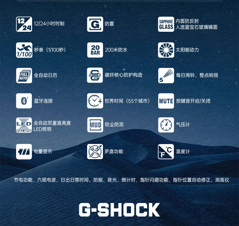 主要功能: 12/24小时时制,防震,内面防反射人造蓝宝石玻璃镜面,秒表(1/100秒),200米防水,太阳能动力,全自动日历,碳纤核心防护构造,每日闹铃、整点响报,蓝牙连接,世界时间(55个城市),按键音开启/关闭,全自动双重高亮度LED照明,防尘防泥,气压计,电量显示,罗盘功能,温度计,节电功能,六局电波,日出日落时间,防振,夜光,倒计时,指针闪避功能,指针位置自动修正,测高仪